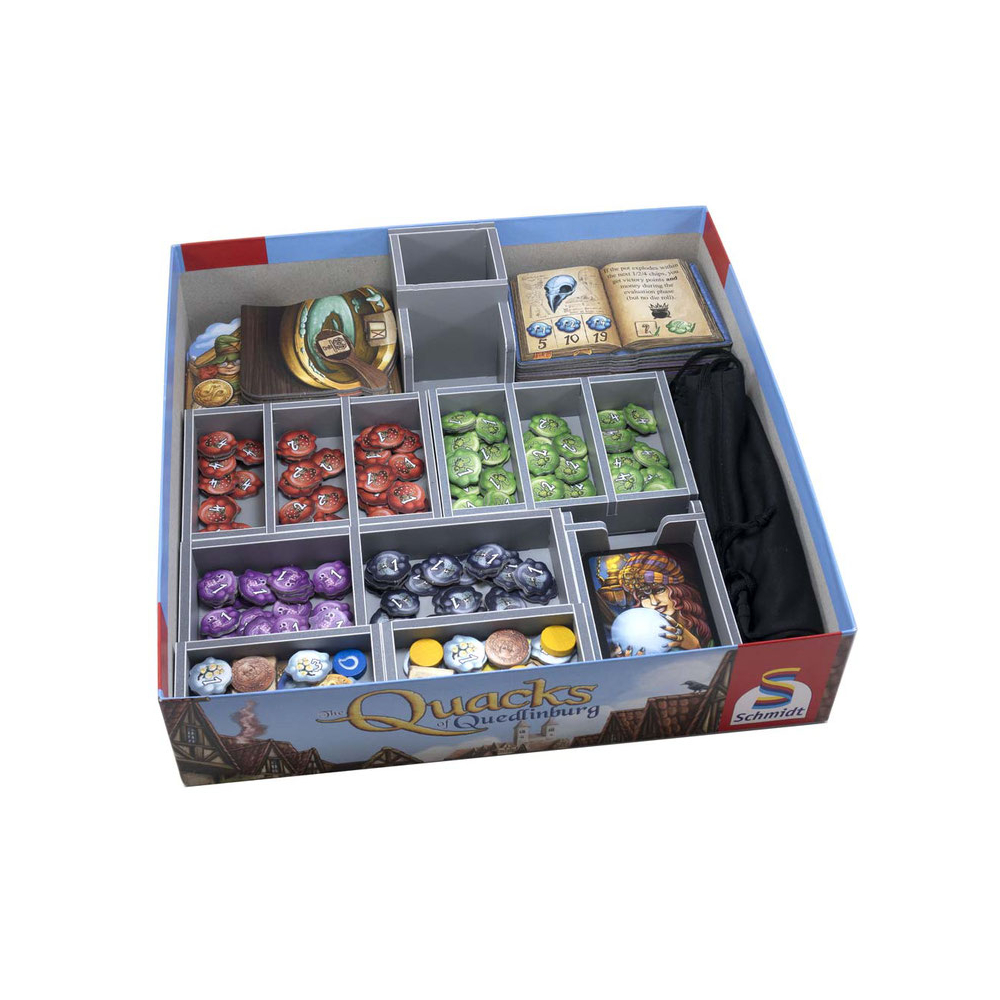 В органайзере удобно размещаются игровые элементы не только базовой игры, но и дополнений "Шарлатаны из Кведлинбурга: Ведьмы-травницы" (The Herb Witches) и "Шарлатаны из Кведлинбурга: Алимики" (The Alchemists).
